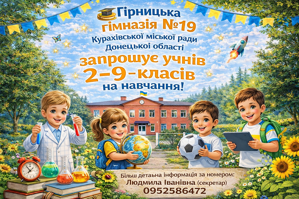 📚 Гірницька гімназія №19 Курахівської міської ради Донецької області запрошує учнів 2–9 класів на навчання! 🌟