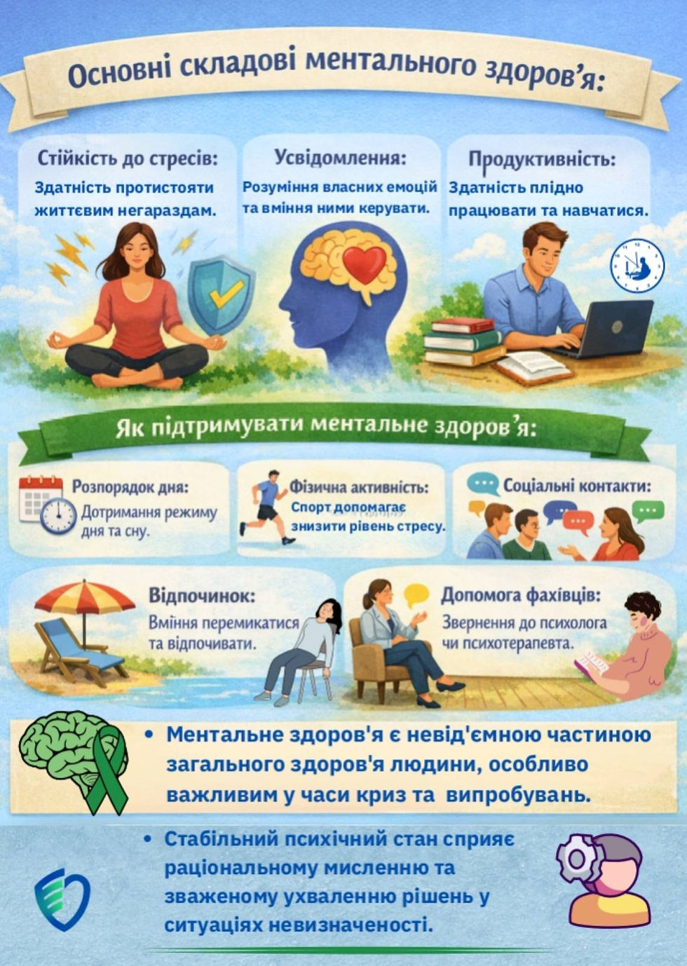 Основними складовими ментального здоров’я є:🔹 Стійкість до стресів — здатність протистояти життєвим труднощам🔹 Усвідомлення — розуміння власних емоцій і вміння ними керувати🔹 Продуктивність — здатність ефективно навчатися та працювати